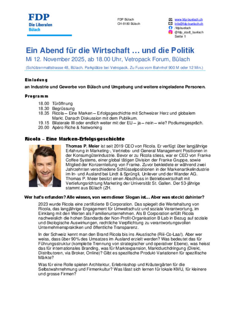 Gastgeber ist die Vetropack Holding AG in Bülach (Schützenmattstrasse 48), die im Anschluss an Referate und Diskussionen einen Apéro Riche offerieren wird. Türöffnung ist um 18:00 Uhr. Weitere Details zum Anlass und den Teilnehmenden finden Sie hier. Wir freuen uns auf Ihre Teilnahme und danken Ihnen für die frühe Anmeldung über folgenden Link: zur Anmeldung.